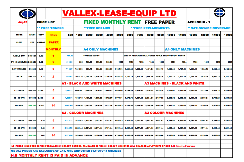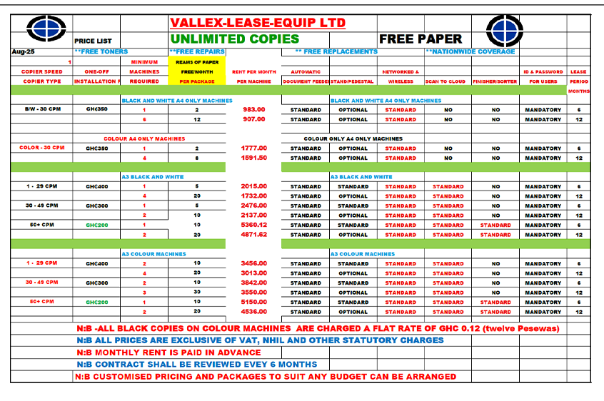 With Vallex-lease Equip photocopier Leasing, Various sizes of MFP photocopiers are provided for the use of Clients (Lessees) Free of any Fixed Monthly Rental Charge. Rather, payment for the use of the photocopiers is tied to usage.